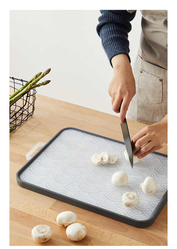 这款是第二代的加厚款,相比于初代,第一是变成了双面,正面304不锈钢、反面PP材质,中间加了一层木板材质,更厚更实用;第二是周边增加了一圈TPR橡胶,使菜板不与台面直接接触,更卫生,同时汁水不易外流。