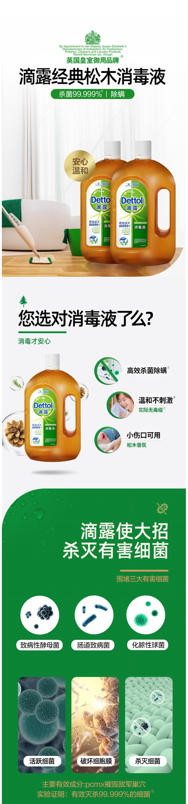 这款滴露 杀菌消毒液,主要有效成分是PCMX,可有效杀灭99.999%的大肠杆菌、金黄色葡萄球菌等有效细菌,含有清香松油,淡淡清香;可兑水用于伤口消毒,也可以用于地板消毒、衣物消毒、家居消毒等。