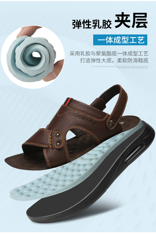 这款男式真皮凉鞋两用沙滩鞋,精选头层牛皮鞋面,柔软细腻,柔软透气,且有光泽;乳胶夹层鞋床,贴合省力,拒水打滑,行走省力不打滑;手工缝制,加厚按摩底,省心两穿设计,凉拖随心切换;弹力气垫鞋底,柔软舒适软弹。