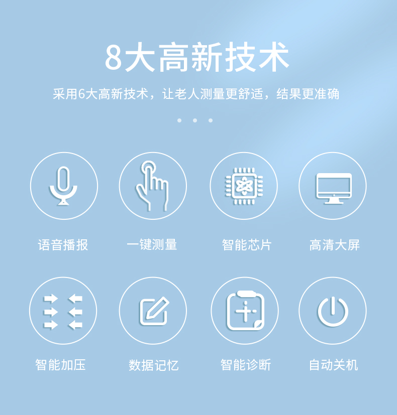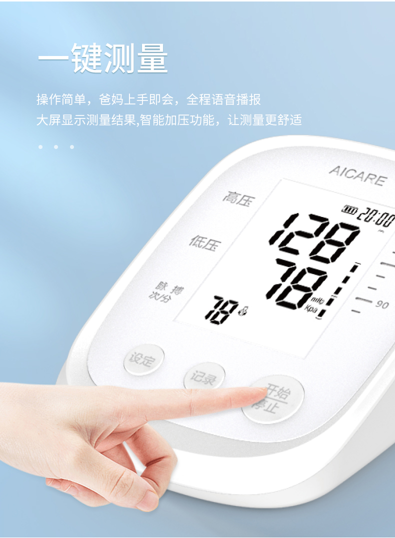 这款掌护 智能语音电子血压计,选用优质芯片,测量结果准确稳定。操作上非常简单,气泵自动智能加压,一键测量即可,爸妈上手即会,还有全程语音播报,高清大屏显示测量结果,两分钟未使用自动关机。