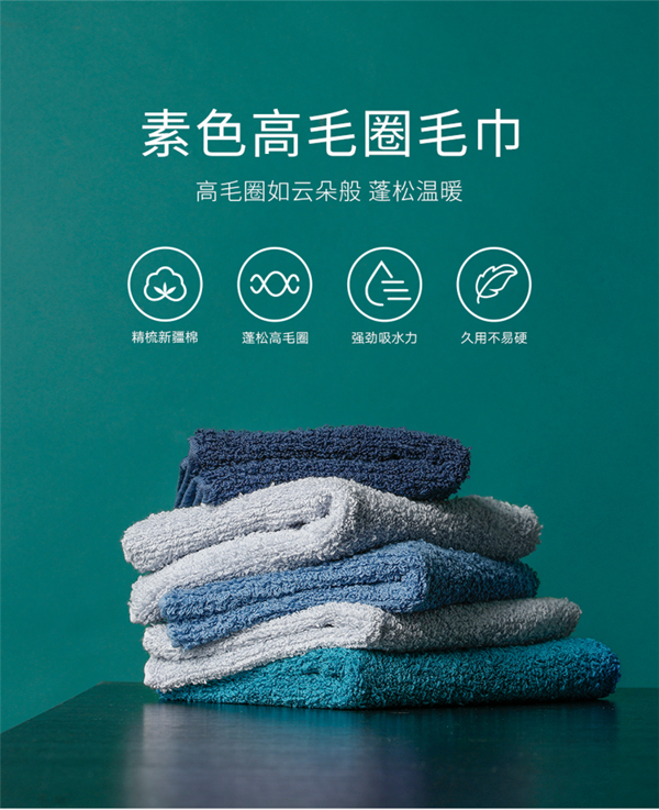 外观设计发明专利,高毛圈组织结构。面料甄选新疆精梳棉纱,纤维柔长,触感柔软,特殊织造工艺,两朵毛圈变成一朵高毛圈,去除短毛绒,增添固接组织,不易勾毛不易掉毛,够长久保持饱满厚实,强力吸水,拥有海绵一样的使用感受,