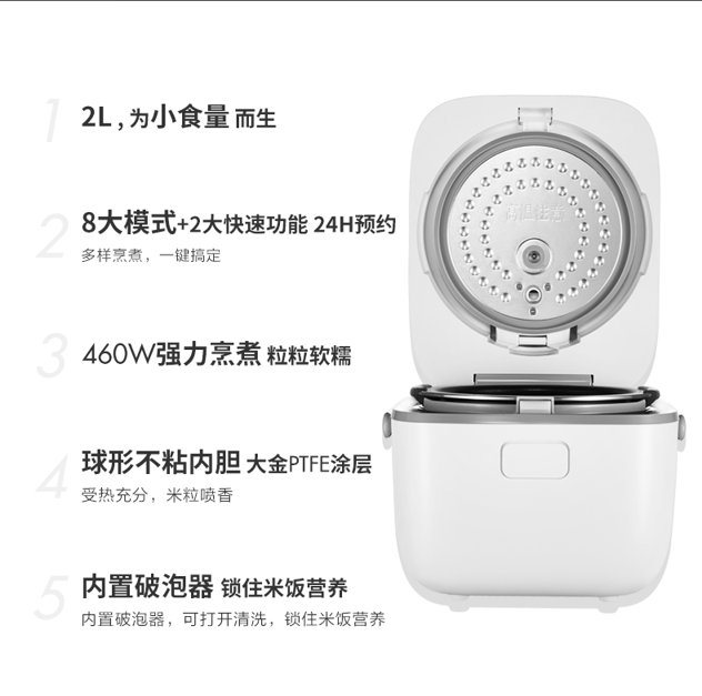 这款双立人 迷你电饭煲,2L容量,适合3口之家使用,机身小巧易收纳,有8大模式+2大快速功能,可根据所选模式,大火力智能动态调节。球形安全内胆,采用大金PTFE涂层,食品级安全,不粘锅、不糊底、受热均匀更能锁住食材本味,锅内还内置破泡器,可让米饭的营养和甜份可充分渗透,口感更香甜。
