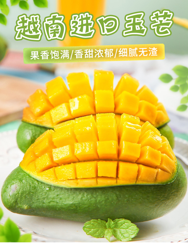 越南进口 玉芒,越南原产,果皮青绿,果肉亮黄多汁,细腻肥厚,香甜微酸,营养价值高,含有丰富的胡萝卜素、维生素、膳食纤维,口感清爽甜蜜,单果重300-400g,收到后需催熟,软了即可食用。