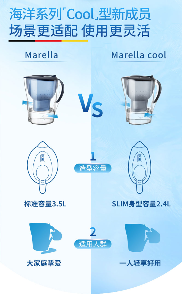 德国的Brita碧然德是过滤水系统行业的领头羊,这款为 海洋系列slim版,滤水壶容量为2.4L,比较适合单人使用。采用BPA-Free无毒塑料,防滑手柄,橡胶软脚,指压式开闭注水口,不用打开上盖就可加水,使用比较方便。