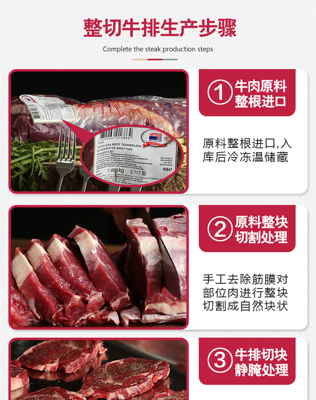 澳洲原装进口,只卖2个月内的新鲜肉,非久藏冻肉,整块切割,非拼接,采用手工分割去膜,不含工业添加剂,套餐包括眼肉牛排130g*3,西冷牛排130g*5,菲力牛排130g*2、刀叉1副、黑椒酱10包、煎锅。