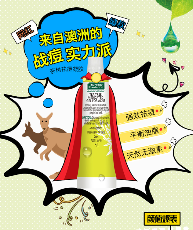 这款星期四农庄Thursday Plantation茶树祛痘凝胶,澳洲进口,主要成份是20%茶树精油,天然茶树成分不含激素,可减少皮肤敏感、刺激或红肿,对痘痘、暗疮、粉刺、黑头、白头等有改善作用,适合痘痘肌、敏感肌人群。