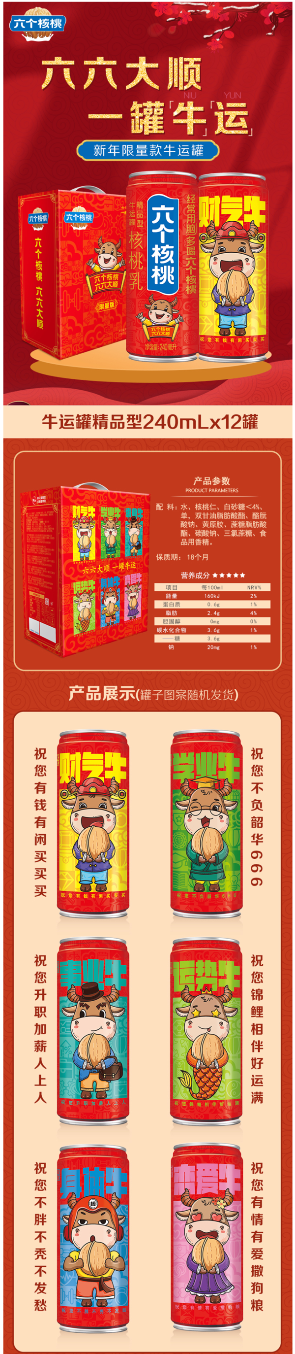 这款养元六个核桃植物蛋白饮料是牛年限量款,精选新疆、云南、太行山3大核心产区优质核桃,富含脂肪酸,增强脑力,纯核桃发酵,不含胆固醇。