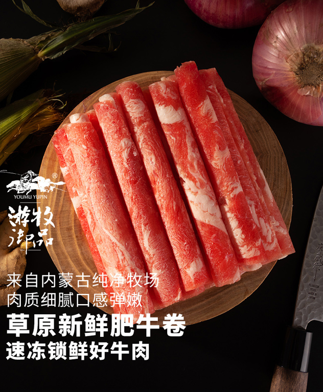 这款游牧御品 正宗内蒙古雪花肥牛肉卷,选用来自内蒙古纯净牧场的优质黄牛肉,肥瘦均匀,肉质细腻,入口弹嫩,涮锅不散。
