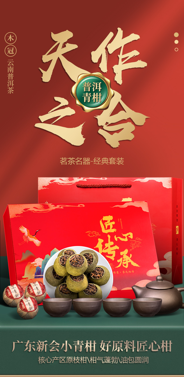 广东新会小青柑,内料萃取百年古树产的宫廷上等普洱。柑皮厚实,既有柑皮果香,也有普洱醇香,入口清甜甘润,回甘上乘,一颗可泡一整天,具有排毒养颜,去油解腻,护肝护胃等功效。