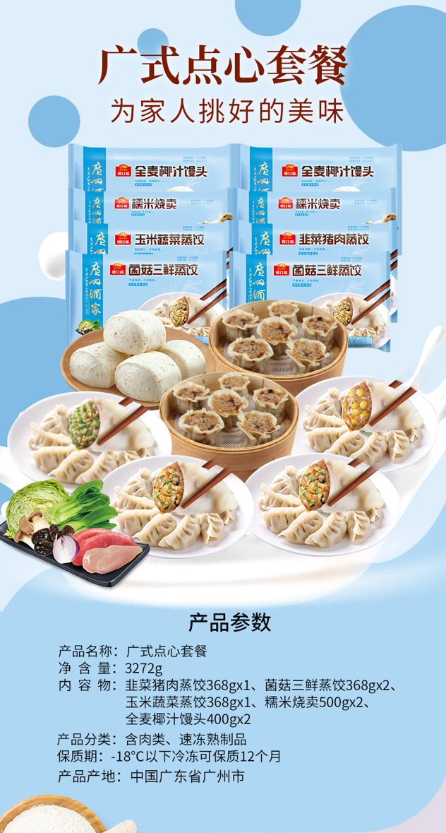 天猫广州酒家旗舰店98元,可领15元优惠券,实付83元到手。这款广州酒家 利口福 蒸饺烧麦点心组合 8袋3272g,包含韭菜猪肉蒸饺368g*1、菌菇三鲜蒸饺368g*2、玉米蔬菜蒸饺368g*1、糯米烧卖500g*2、全麦椰汁馒头400g*2,蒸饺个大馅足,皮薄馅多,香醇美味,口口满足,荤素合理配比,锁住食材原有的味道。糯米烧卖皮薄劲道,软糯可口,口感柔软细滑,蒸一蒸,晶莹剔透。全麦椰汁馒头,麦味浓郁,香气扑鼻,香软可口。
