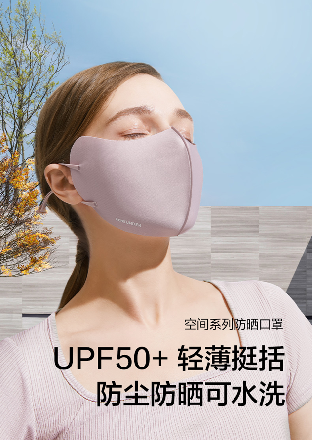 这款蕉下防晒口罩,蕉下防晒系列新品,UPF50+,紫外线阻隔率达95%;严选Nylon科技型功能面料,亲肤凉感,专业级透气且抑菌,防晒性能优越,可持续户外使用。面料具高弹力且不易变形,佩戴舒适无紧绷感,解放脸部肌肉;鼻子处经特殊设计,既能完全包覆鼻子,紧密贴合,亦能实现透气,兼具美观与实用型。物理防晒也很重要哦~