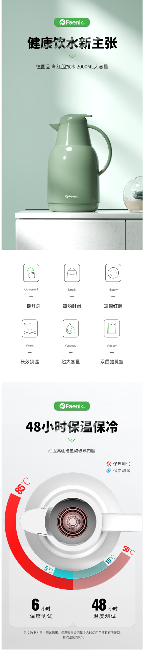 旋式密封锁温壶盖,食品级密封硅胶圈,防尘仿鹰啄壶嘴,出水流畅,省力按压,即可一键出水。