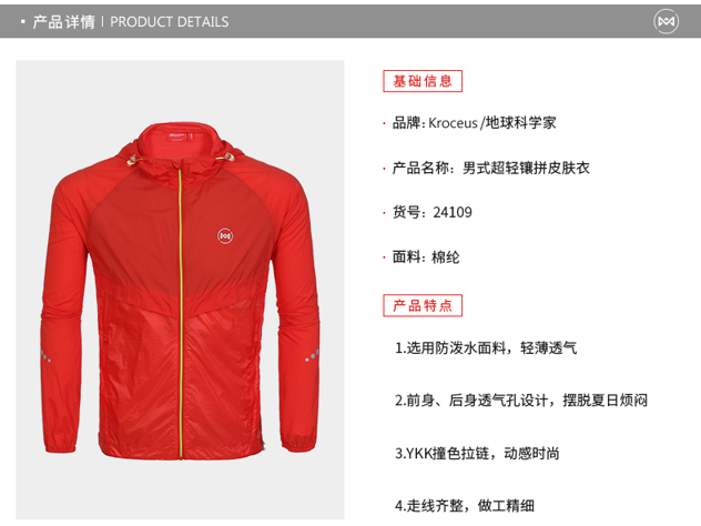 在款式上,无帽/一体连帽设计,前身和后身都有专门的透气孔,弹力松紧袖口和下摆防止漏风,YKK拉链,衣服可以轻便易收纳。