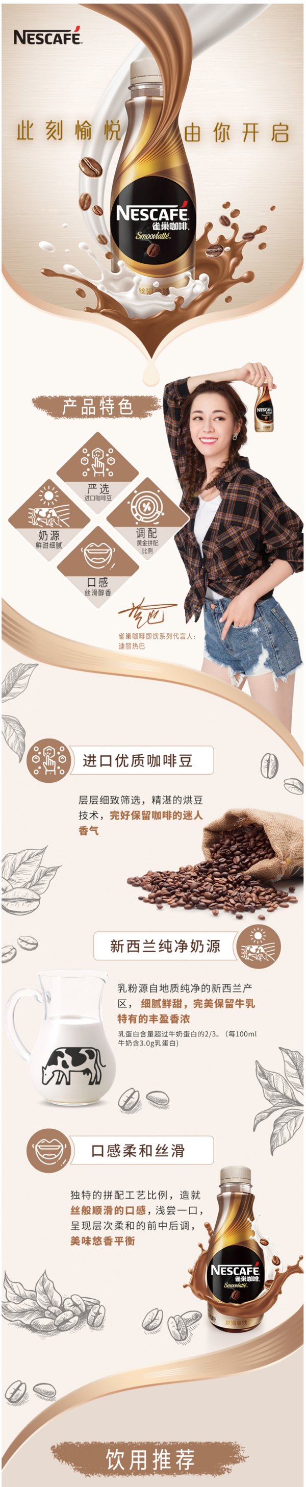 这款雀巢 即饮丝滑拿铁咖啡,选用优质咖啡豆低温烘焙,保留咖啡的迷人香气,搭配新西兰纯净奶源,细鲜甜,完美保留牛乳特有的丰盈香浓,独特的拼配工艺比例,丝滑般的口感,入口呈现层次柔和的前中后调,美味悠香平衡。