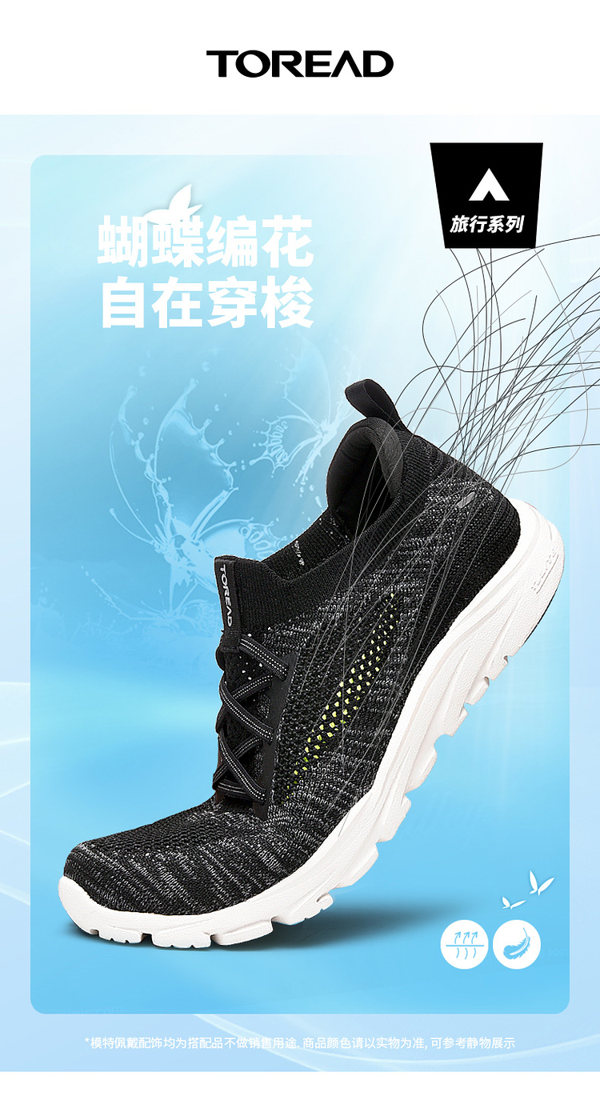 鞋面采用双色混纱一体织的技术,骨架部分为高密度编制,在行走时维持双脚的稳定性和运动支撑性,前掌、脚背以及侧面使用了大镂空的网眼,透气性强,适合春夏季穿着。