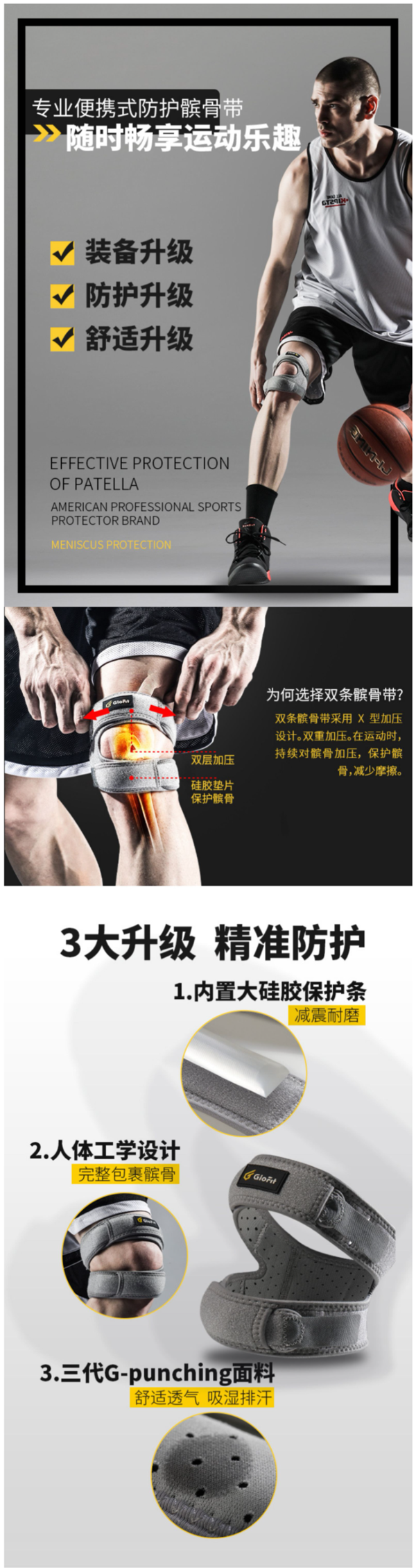 髌骨带起到承上启下的作用,在运动中容易磨损,这款Glofit 专业运动加压髌骨带,是双条髌骨带的组合,运用X型加压设计,双重持续的加压髌骨,减少其磨损,还能有效提供稳定的支撑,起到保护作用。