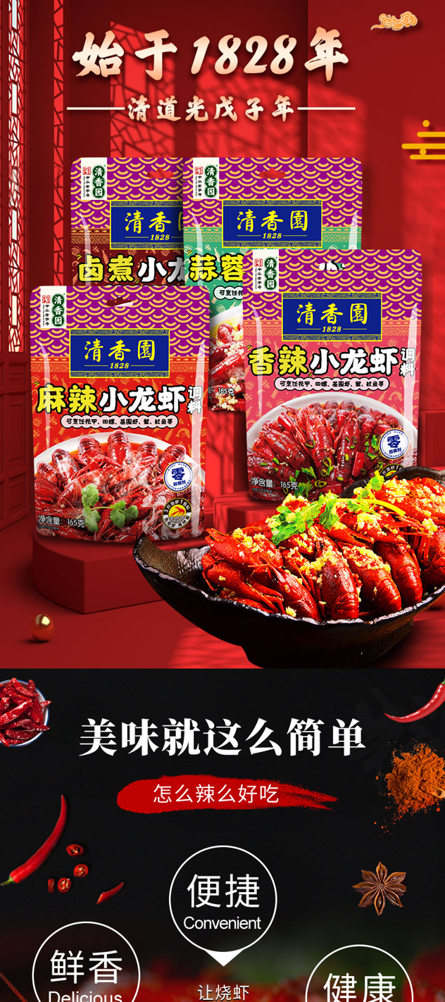 始于道光年间的清香园,中华老字号的麻辣小龙虾调料包,由川味大师秘制,地道的川味酱料包,生产过程中承诺0添加防腐剂,食用安全放心。