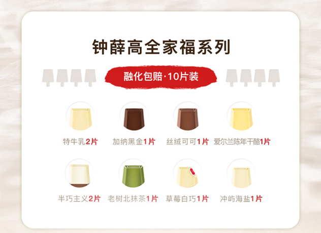 超高口碑钟薛高。全家福系列内含:特牛乳*2片、加纳黑金*1片、 丝绒可可*1片 、爱尔兰陈年干酪*1片、半巧主义*2片、老树北抹茶*1片、草莓白巧*1片、冲屿海盐*1片。精选用料,真材实料,香甜不腻,一次尽享多种美味。
