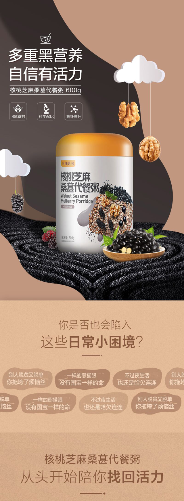 精选黑芝麻、桑葚脯、黑藜麦、黑果枸杞、黑豆、黑米、黑小麦片、黑木耳粉8黑食材,科学配比,其中桑葚脯>4.5%、黑芝麻>7.5%,还特别添加了核桃片>9.5%,无香精、色素和食品添加剂。