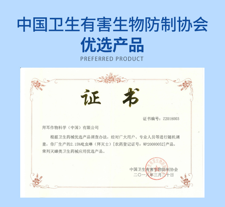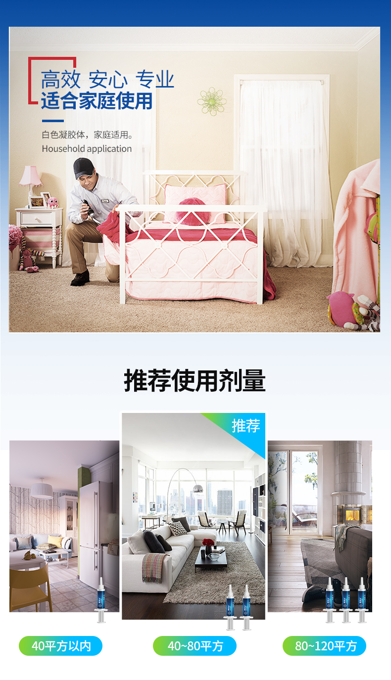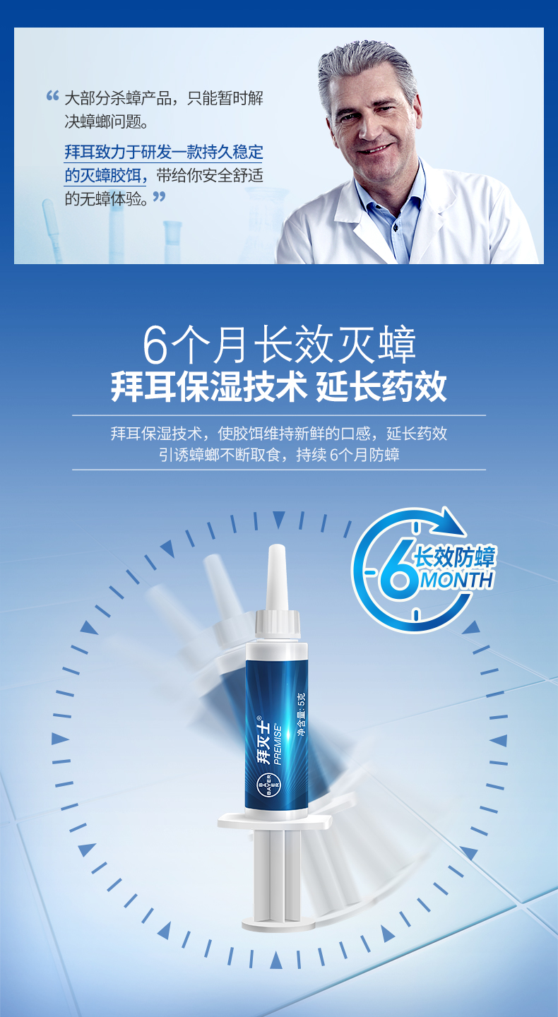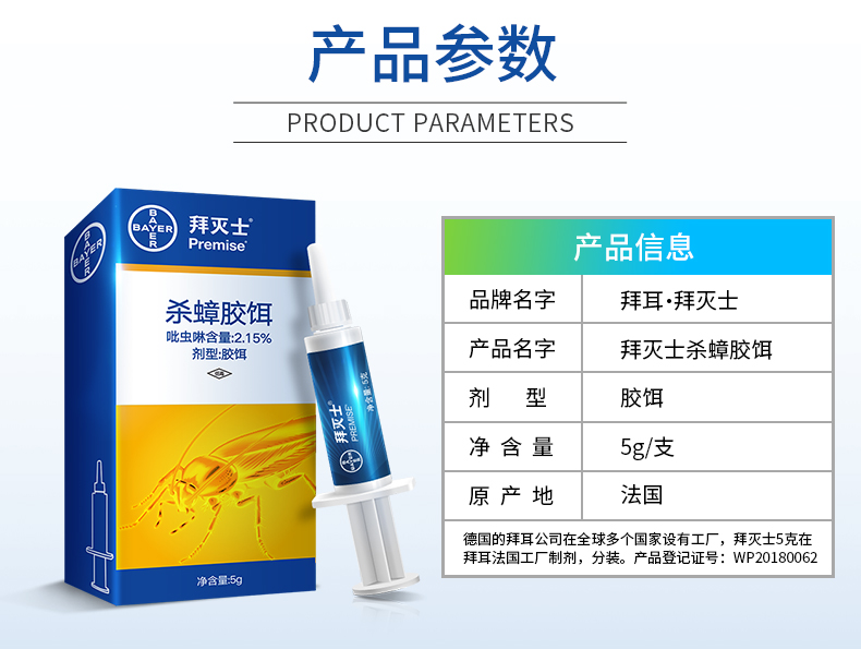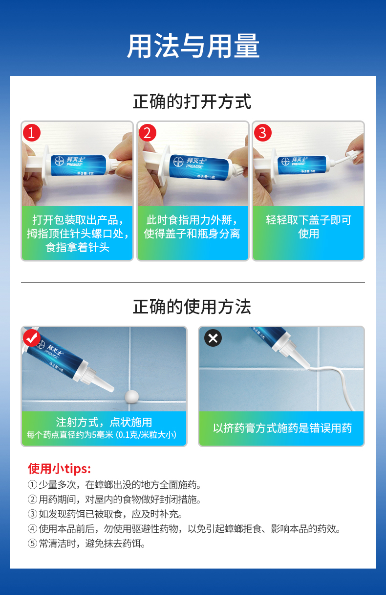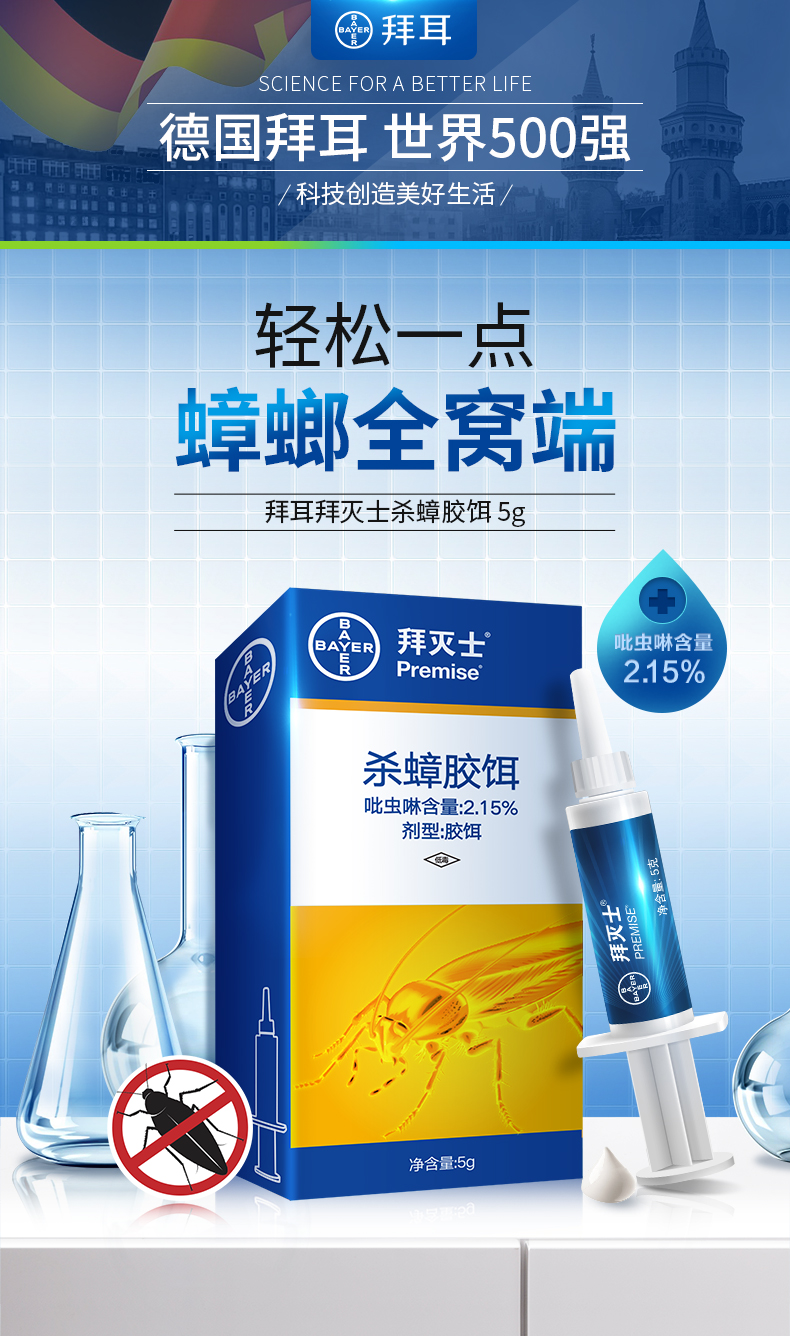 Premise拜灭士是德国Bayer拜耳集团旗下专业的杀虫品牌,这款杀蟑胶饵是专门为剿灭蟑螂而设计的产品,白色凝胶状,产于法国。新版采用尖嘴软管,使用方便,不易堵塞管口。内含2.15%的吡虫啉,无刺激性气味,环保低毒性。只需以绿豆大小点状施用于蟑螂经常出没及隐蔽处即可。蟑螂食用后可通过吐物、粪便或相互残食达到连锁杀灭的效果,大部分蟑螂会死在巢穴内。1至3天见效。规格:5g*1支。