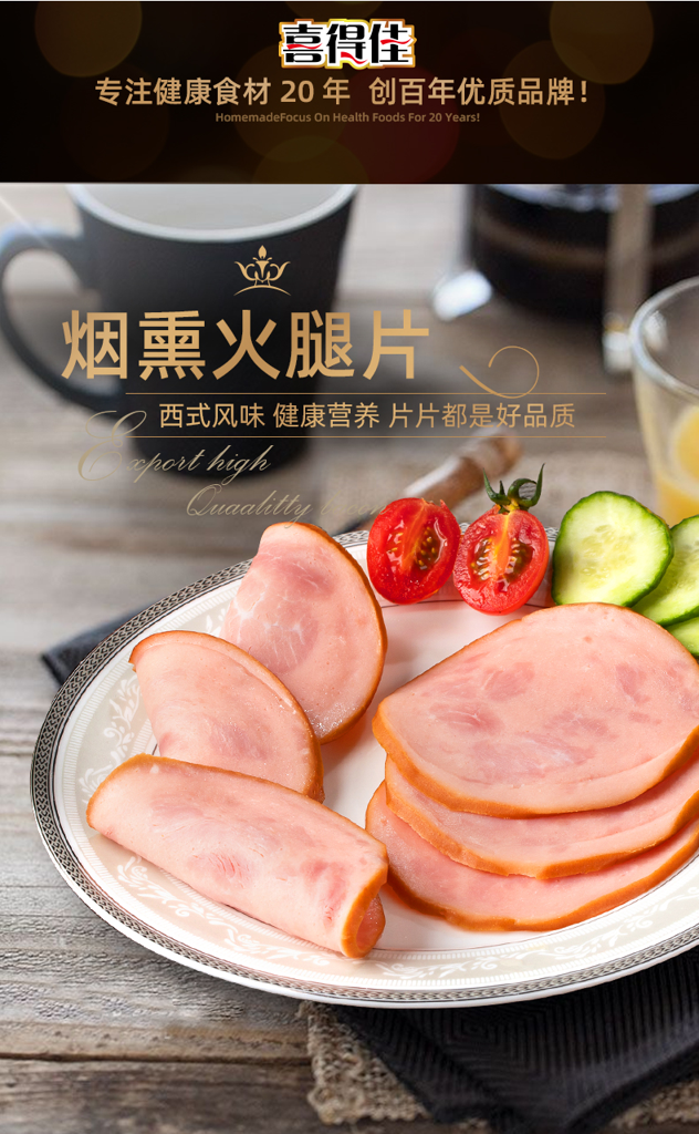 这款喜得佳烟熏低脂火腿片获得了香港Q唛认证,产品品质安全有保障。自建养猪场和屠宰场的猪源,从源头上确保鲜肉的安全和品质,精选高品质猪后腿肉,去除多余的脂肪和软骨,肉感十足,低脂又健康,烟熏工艺制作,原汁原味,鲜爽不腻。