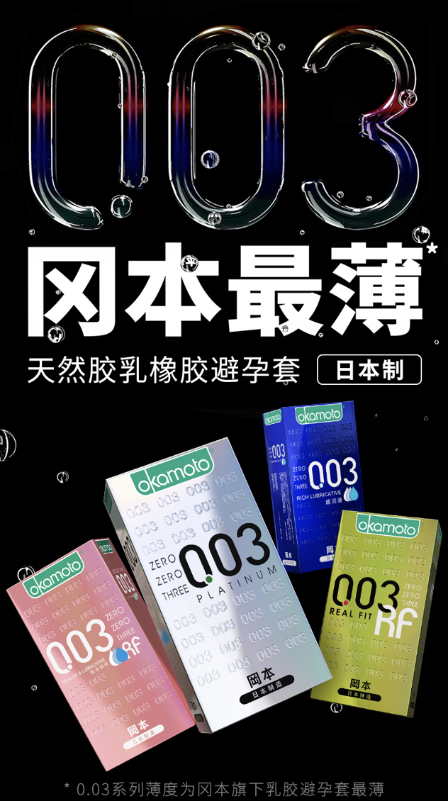 003是冈本旗下胶乳制最薄的,均一薄至0.03mm。冈本一直是业界标杆,在安全套领域以超薄称霸。超薄零距离体验,更软更薄更舒适,冈本003是日本原装的,冈本003确切的说应该是冈本0.03,标称厚度为0.030mm,凸点厚度0.025mm,阔度为52±2mm,长度为172±7mm更符合亚洲人的Sizie,材质为乳胶和润滑剂,带给你接近不带的快感。