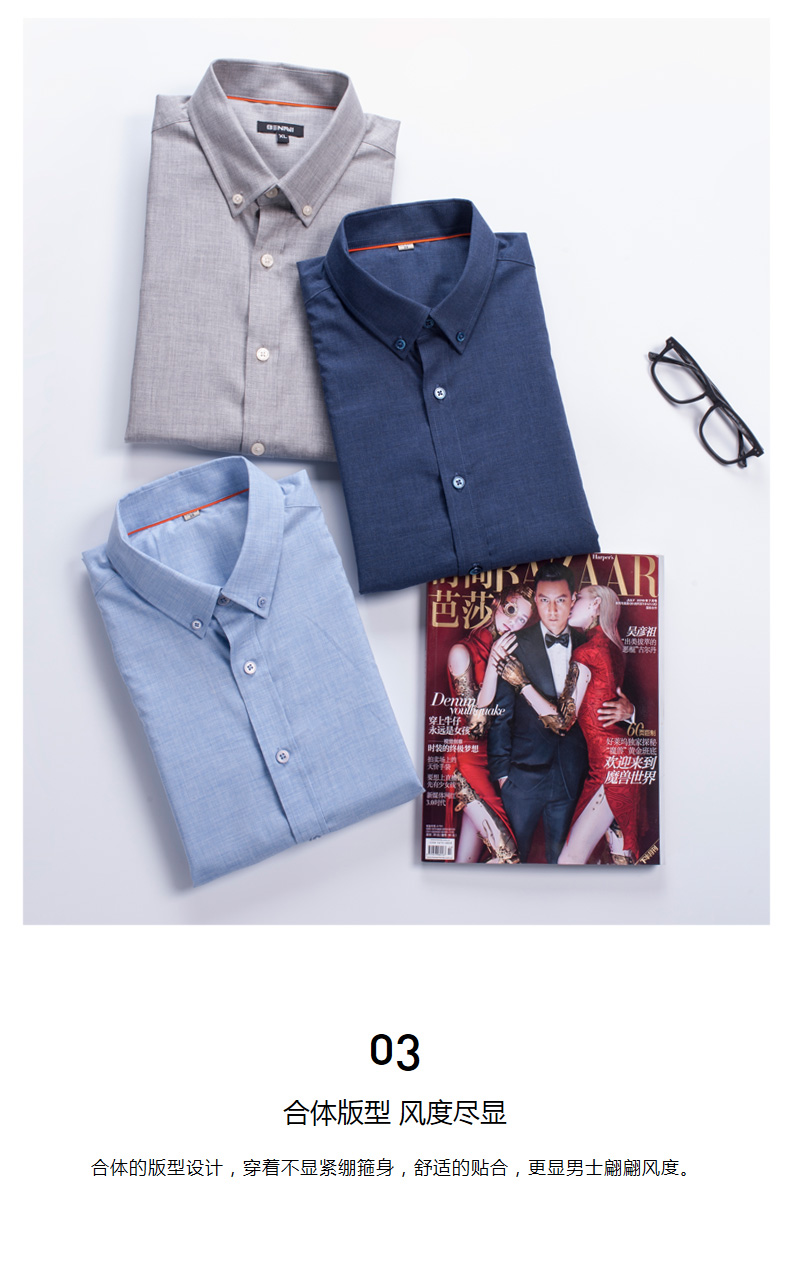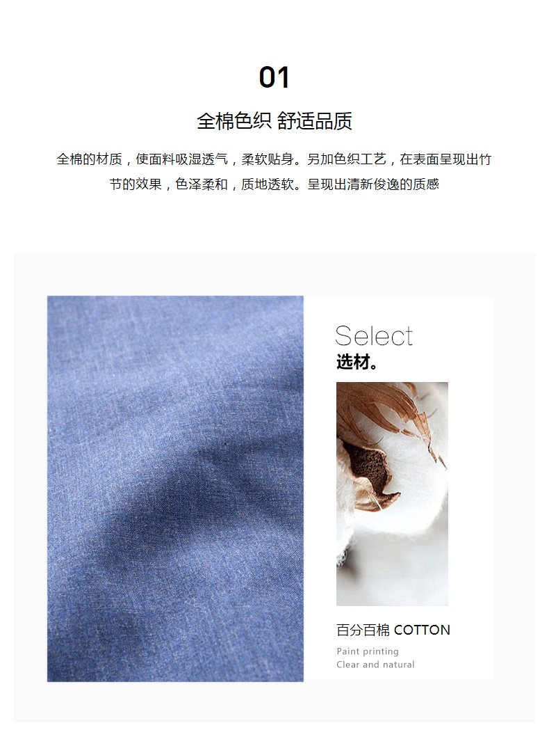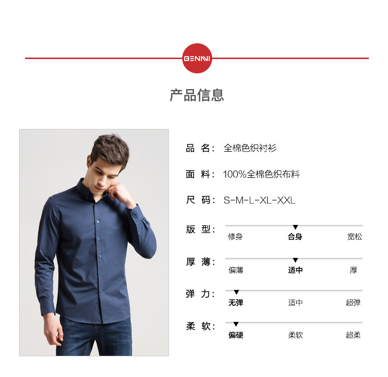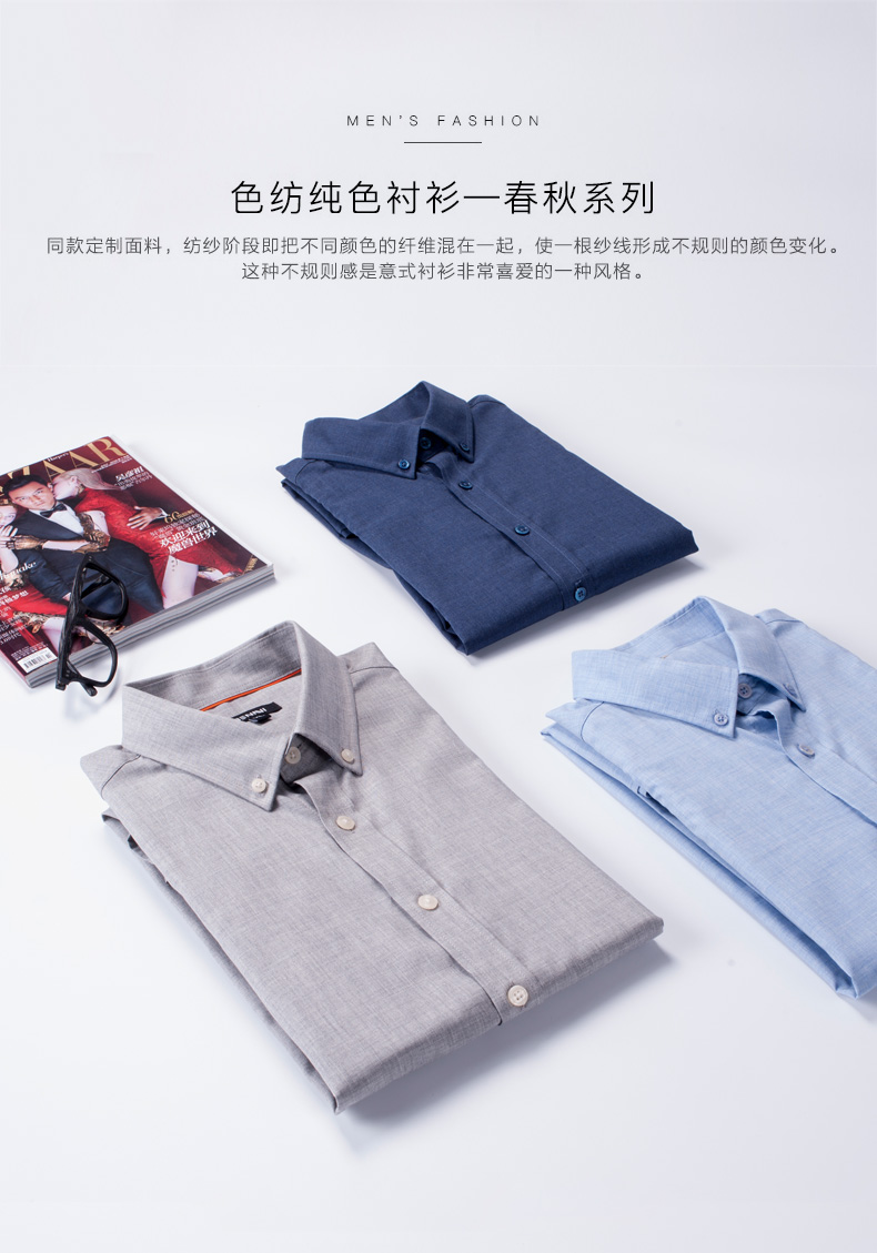本米 男100%纯棉面料衬衫,100支高支高密面料,面料格外柔软细腻,纯棉材质吸湿透气。合体版型,上身不紧绷。定制色纺面料,纺纱阶段将不同颜色纤维混在一起,使每一根纱线都形成不规则的变化,织成面料之后,面料表面形成竹节一样的效果,色泽较更为温润,上身增添清新俊逸质感。