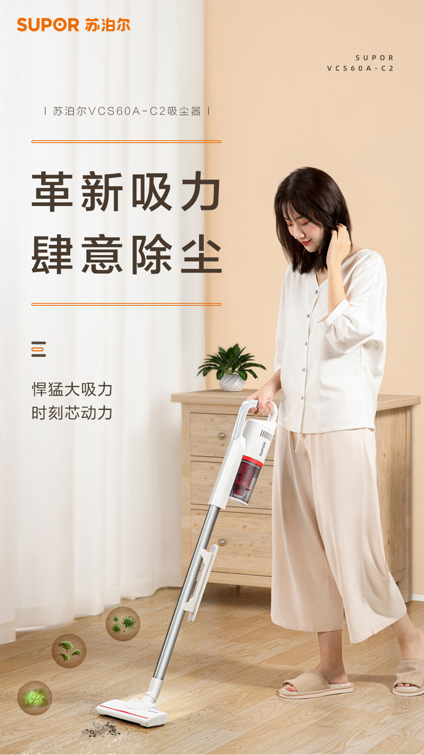 这款苏泊尔VCS60A-C2手持式小型吸尘器,推杆/手持2合1,适用于各个环境。功率是650W,拥有16kPa吸力,主机仅重1.5kg,使用过程中不累手。