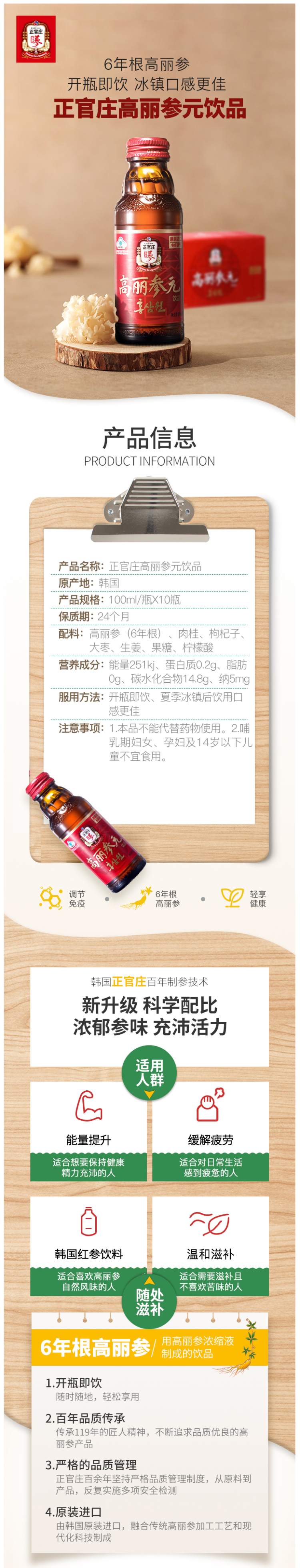 这款正官庄6年根高丽参元液,以6年根高丽参为原材料(高丽参富含32种人参皂甙),在以大枣、肉桂、枸杞子、生姜浓缩液为辅料。特点是易吸收,每支人参皂甙含量达10-20mg。服用方法:1日1次。能够大补元气,提高记忆力,小瓶包装,携带十分方便,可以随时随地饮用来增强活力。