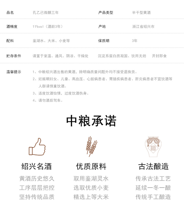 这款孔乙己 三年绍兴黄酒,以糯米、小麦、鉴湖水为原料,使用传统的酿制技艺,农历七月制酒药,八、九月制麦曲,小雪做酒酿,大雪前后投料开酿,用独特的复式发酵工艺发酵90余天,翌年立春开始压榨、煎酒,然后泥封贮藏。