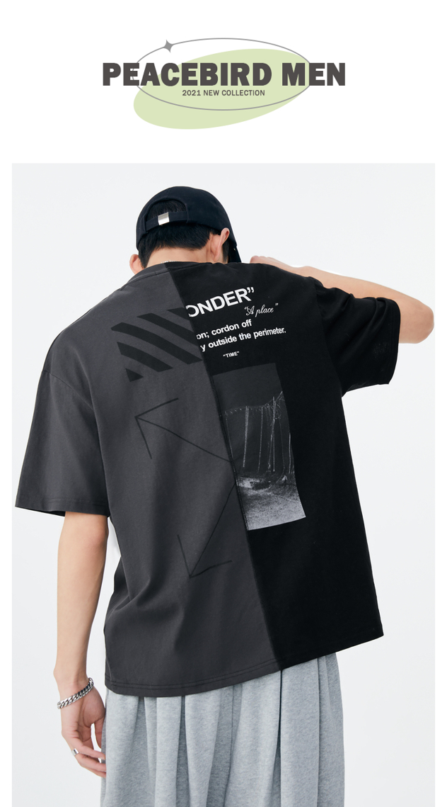 这款太平鸟潮酷拼接短袖T恤,采用精选100%棉质材质,双色拼接设计,舒适圆领,后背有个性印花做装饰,赛博朋克机能风。