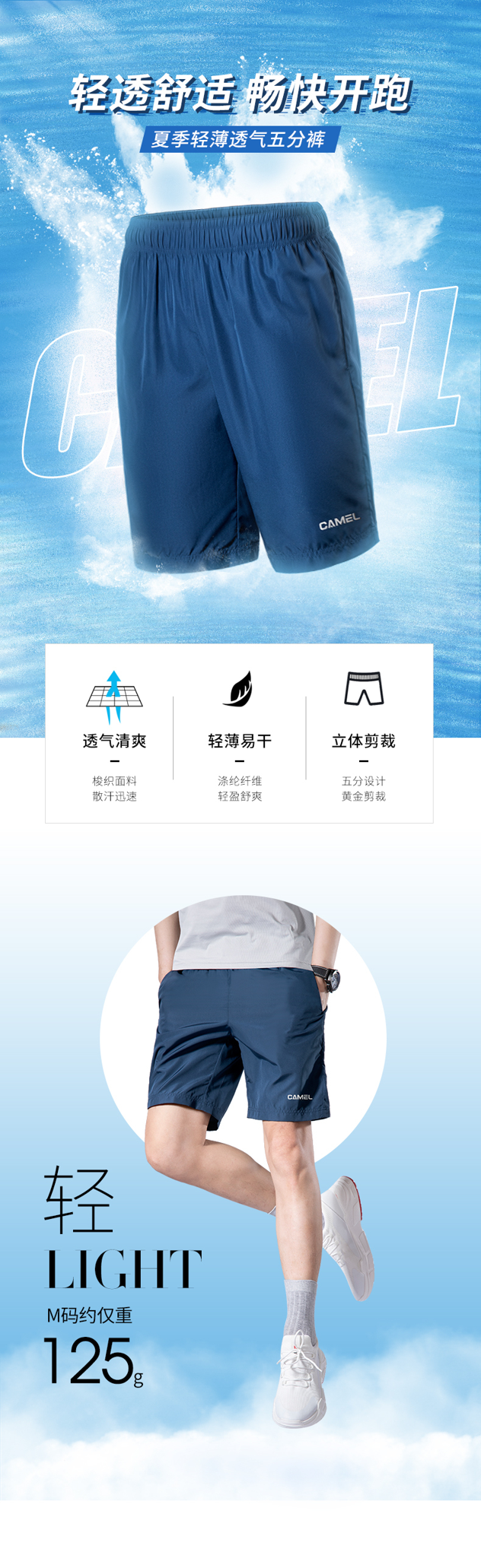这款 骆驼男装 2021夏款透气休闲五分短裤,轻质260T轻亚纺梭织面料,整重仅125g,丝薄顺滑,轻薄易干,轻盈舒爽,黄金立体剪裁,松紧裤腰,适合各种身材。