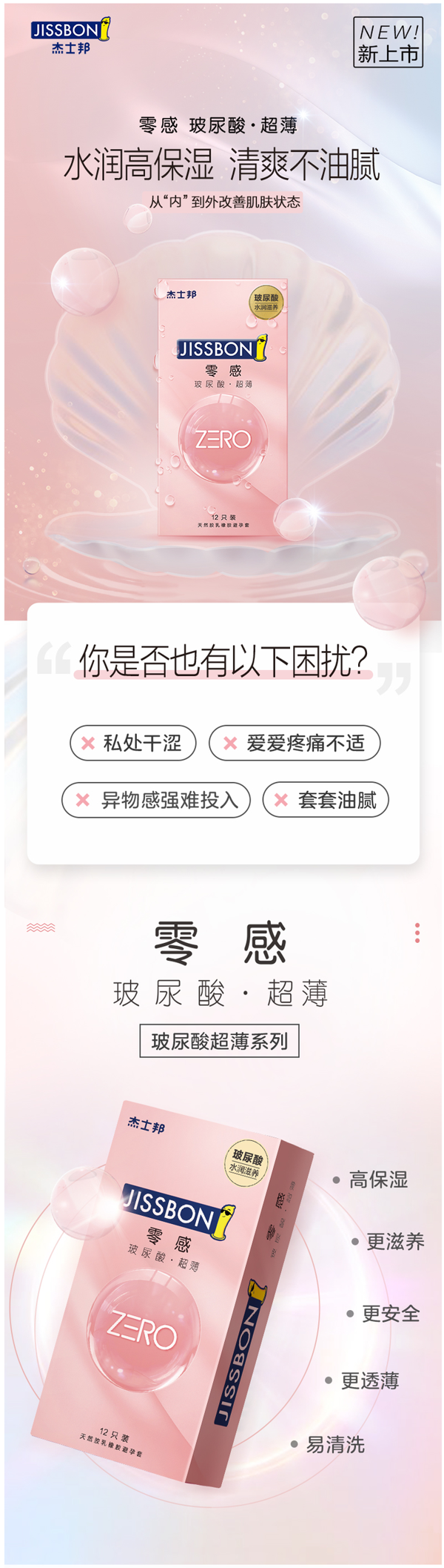 这款杰士邦 零感玻尿酸超薄避孕套,属于零感玻尿酸系列,专为女性干涩设计,拥有水润高保湿、清爽不油腻的优点,带来SPA级水润畅爽体验。