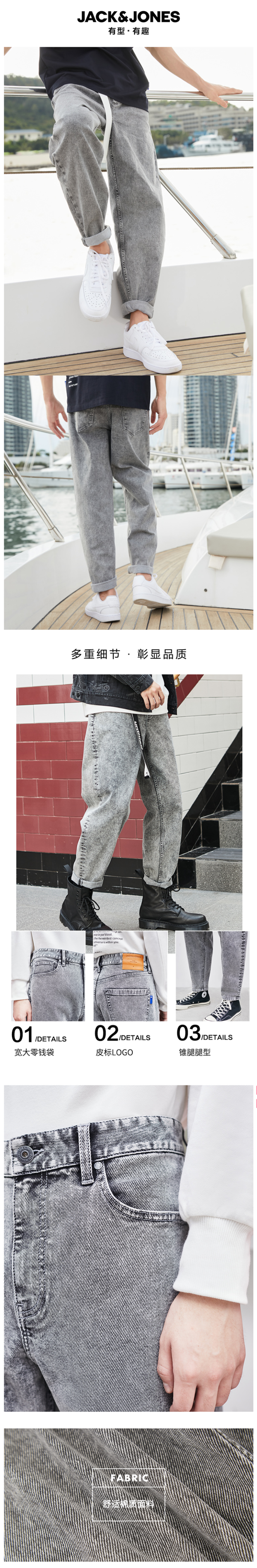 在款式上,宽松版型,锥形裤腿,上身显瘦,特别的复古做旧水洗处理,顿显得潮流时尚风,门襟是YKK拉链,质量靠谱不易坏。