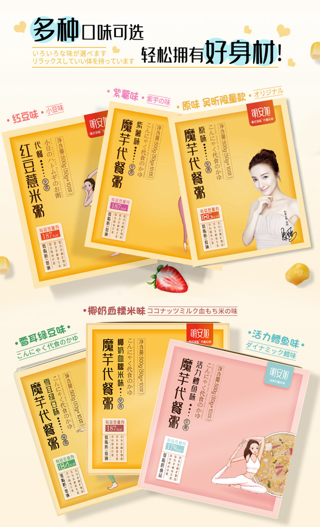 天猫明安旭旗舰店39.9元,可领30元优惠券,实付9.9元到手。吴昕代言,明安旭 魔芋代餐粥,名字虽然是魔芋代餐粥,实际上除了魔芋粉,还含有胶原蛋白微粒粉、薏米粉、红豆粉、茯苓粉、山药粉、扁豆粉、藕粉、葛根粉、燕麦片、绿豆片....等等共25种果肉五谷,科学食材配比,专为代餐研制,均衡营养,低热量摄入,饱腹感达4小时。开水冲泡即可食用,非常方便。规格:50g*10袋