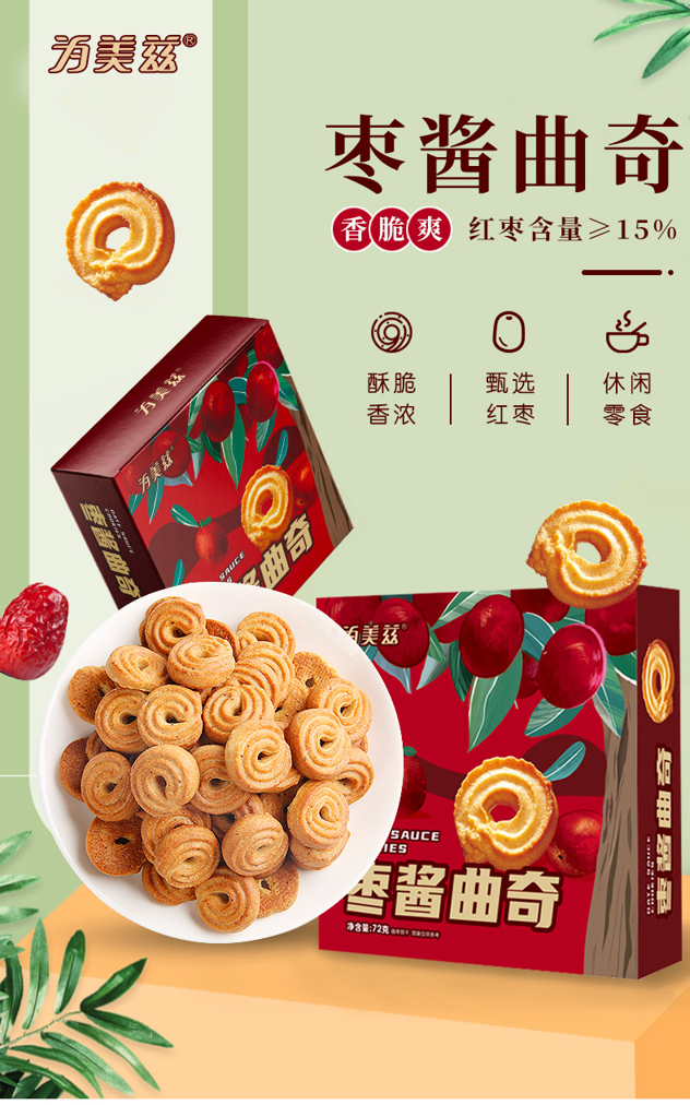 天猫为美兹旗舰店5.6元,拍10盒可领10元优惠券,10盒实付19.9元到手;枣酱曲奇,丹麦工艺,精选好材料,酥脆香浓,甄选红枣,15%的红枣含量,满满都是枣香,饱香的曲奇,将红枣碎紧紧包裹,这一场邂逅是红枣遇上曲奇