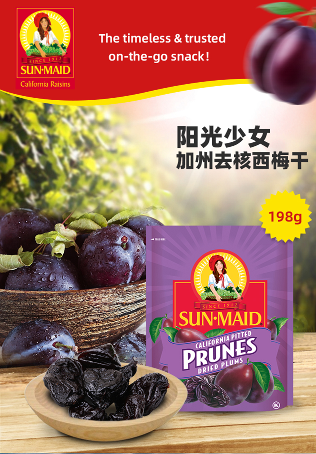 这款阳光少女SUN·MAID 美国加州去核西梅干,精选加州中央山谷高品质阿让西梅,饱满肉厚、鲜甜味美,经过干燥、清洁、分类、加工、去核、检查和包装,不添加糖,0脂肪、0胆固醇,健康安全。