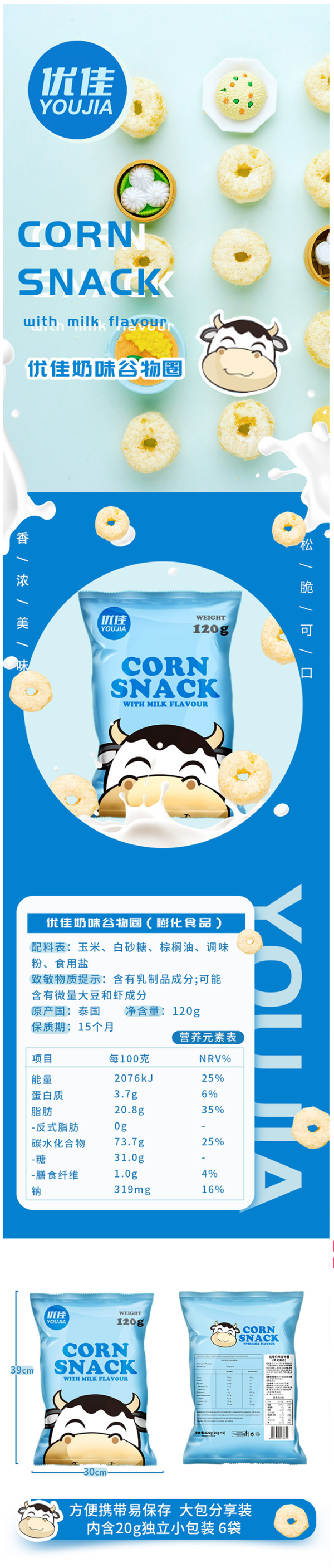 这款优佳谷物圈是一款即食早餐冲泡玉米麦片,泰国进口,主要是由玉米粉、白砂糖、棕榈油等制成,酥脆可口,开袋即食,或搭配牛奶冲泡食用。