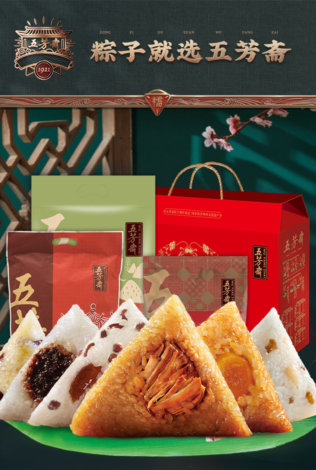 五芳斋(WU FANG ZHAI)是浙江五芳斋集团旗下粽子品牌,始于1921年,其产品线涵盖粽子,盐鸭蛋,卤味,东坡肉等。