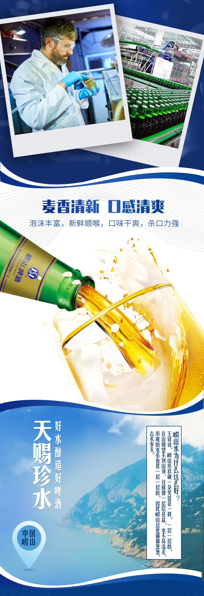 崂山啤酒隶属于青岛啤酒股份有限公司,是参照青岛啤酒生产技术标准进行生产的第二品牌,被评为山东省名牌产品。通过了英国UKAS皇冠标志质量认证和ISO9002国际质量认证。采用著名崂山泉水和大麦(澳洲麦、加拿大麦、法国大麦)、啤酒花、大米、酵母为原料酿制而成,麦汁浓度8°P。