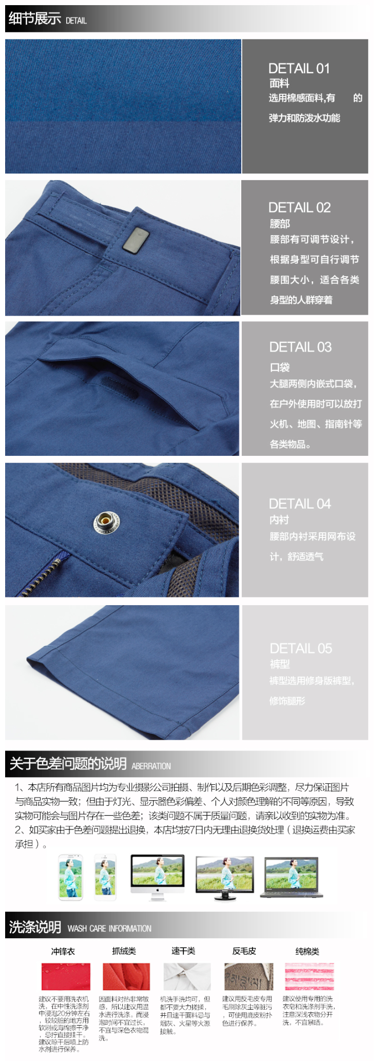 腰部有可调节设计,可根据身型可自行调节腰围大小,适合各类身型的人群穿着。大腿两侧内嵌式口袋,在户外使用时可以放打火机、地图、指南针等各类物品。