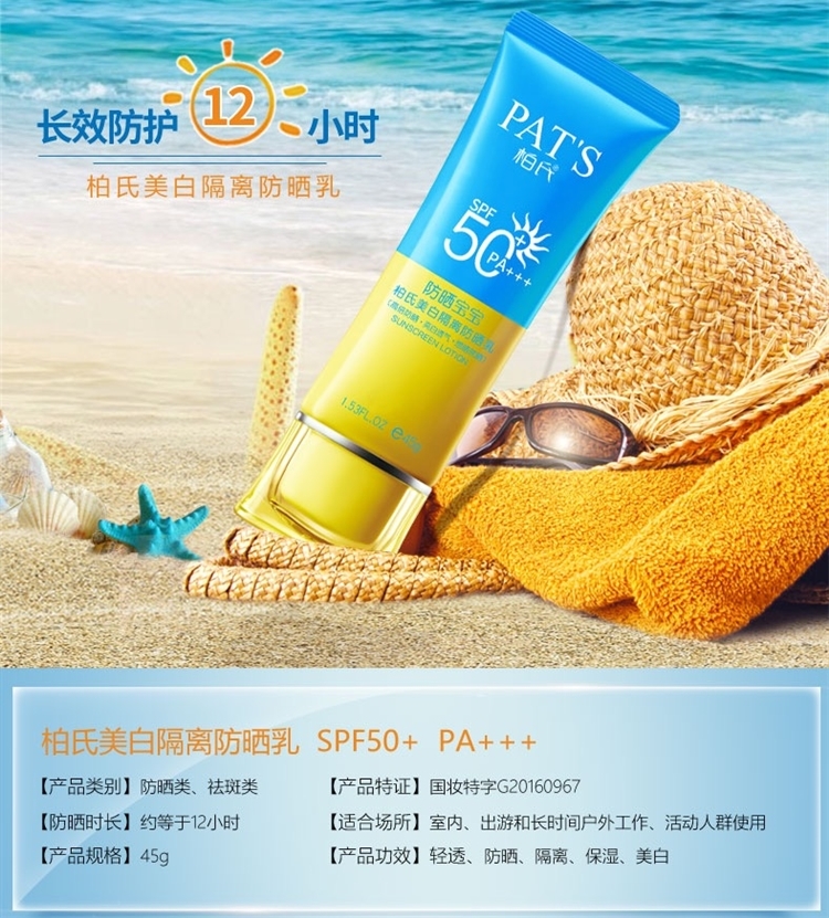这款柏氏 美白隔离防晒霜 45g,涂抹在手上,质感清爽,无油光;防嗮指数为SPF 50,可抵挡12.5小时的防晒,时效长;抵御UVA和UVB对肌肤的伤害,还能美白,夏无论男女,夏季必备。领券链接点此