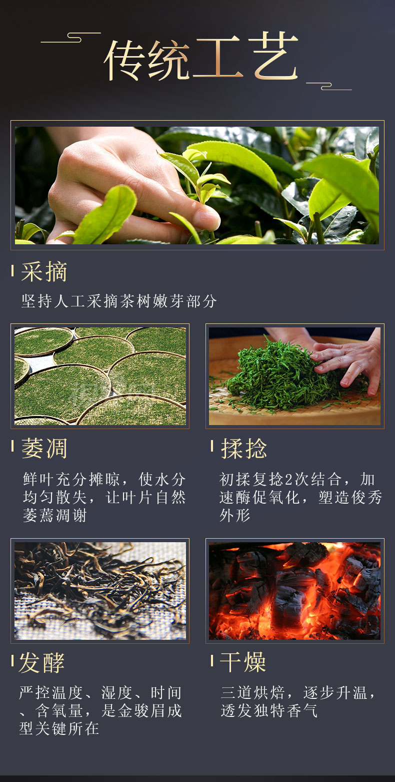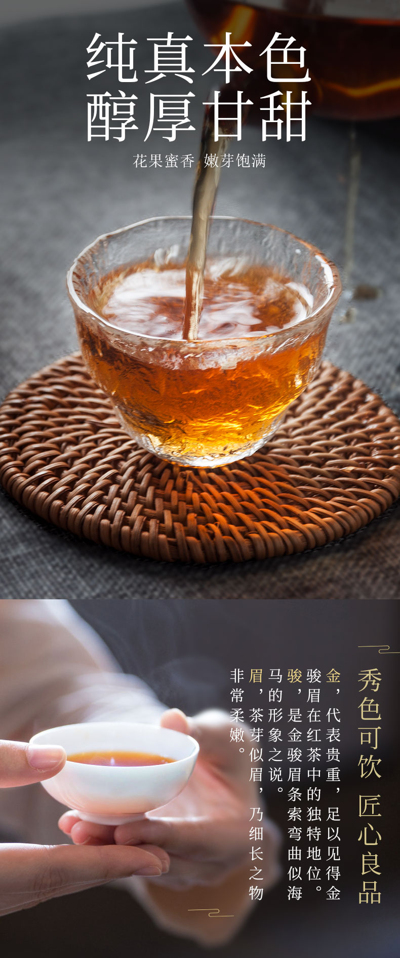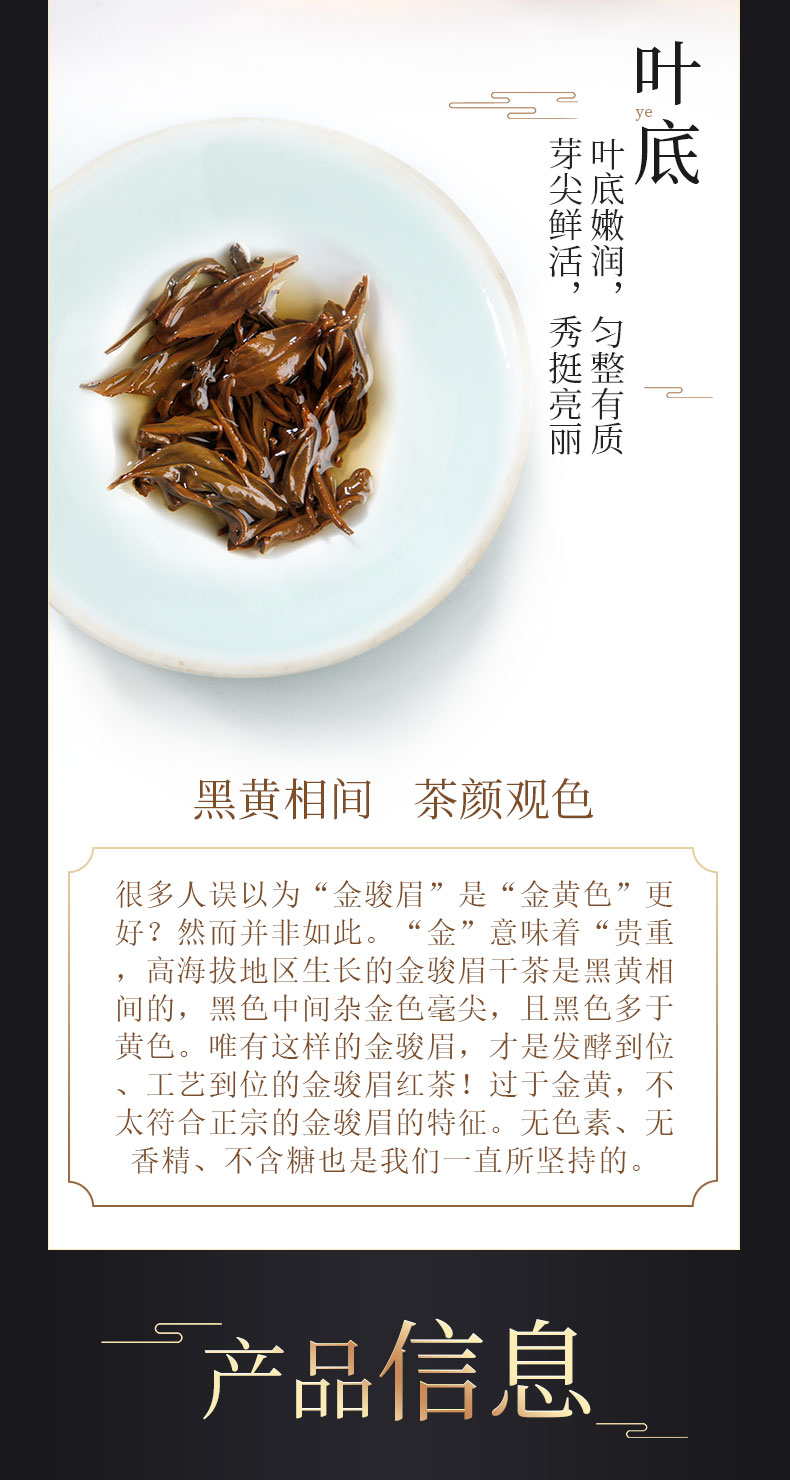 福建武夷山原产地,金骏眉红茶,坚持手工采摘,数十年经验实付炒制,精选一级品质,干茶条索均匀完整,紧细俊秀、黑黄相间、金毫满披,无色素。无香精、不含糖,茶汤橙黄剔透、口感鲜活干爽、甜里透香、蜜香浓郁,茶气十足,数泡仍有余香。