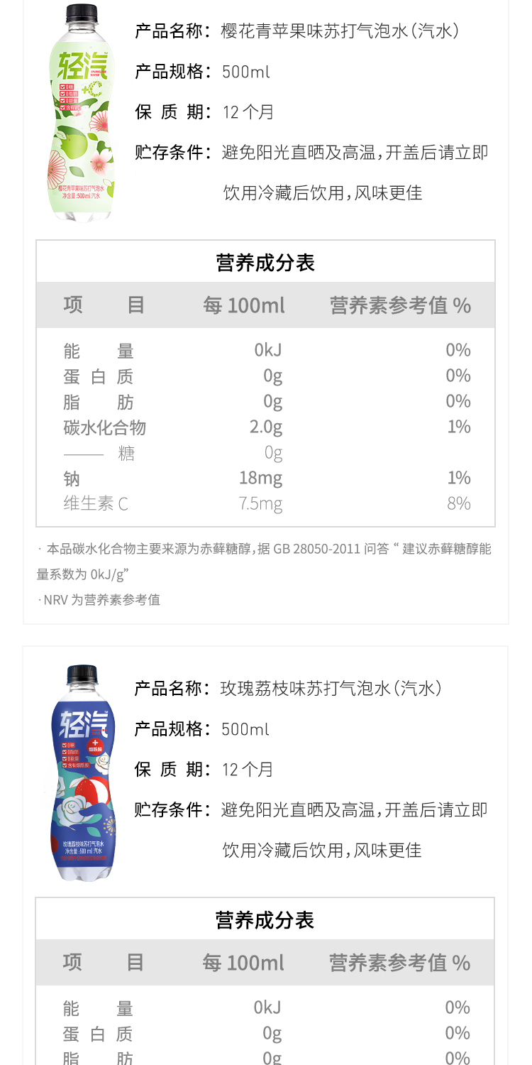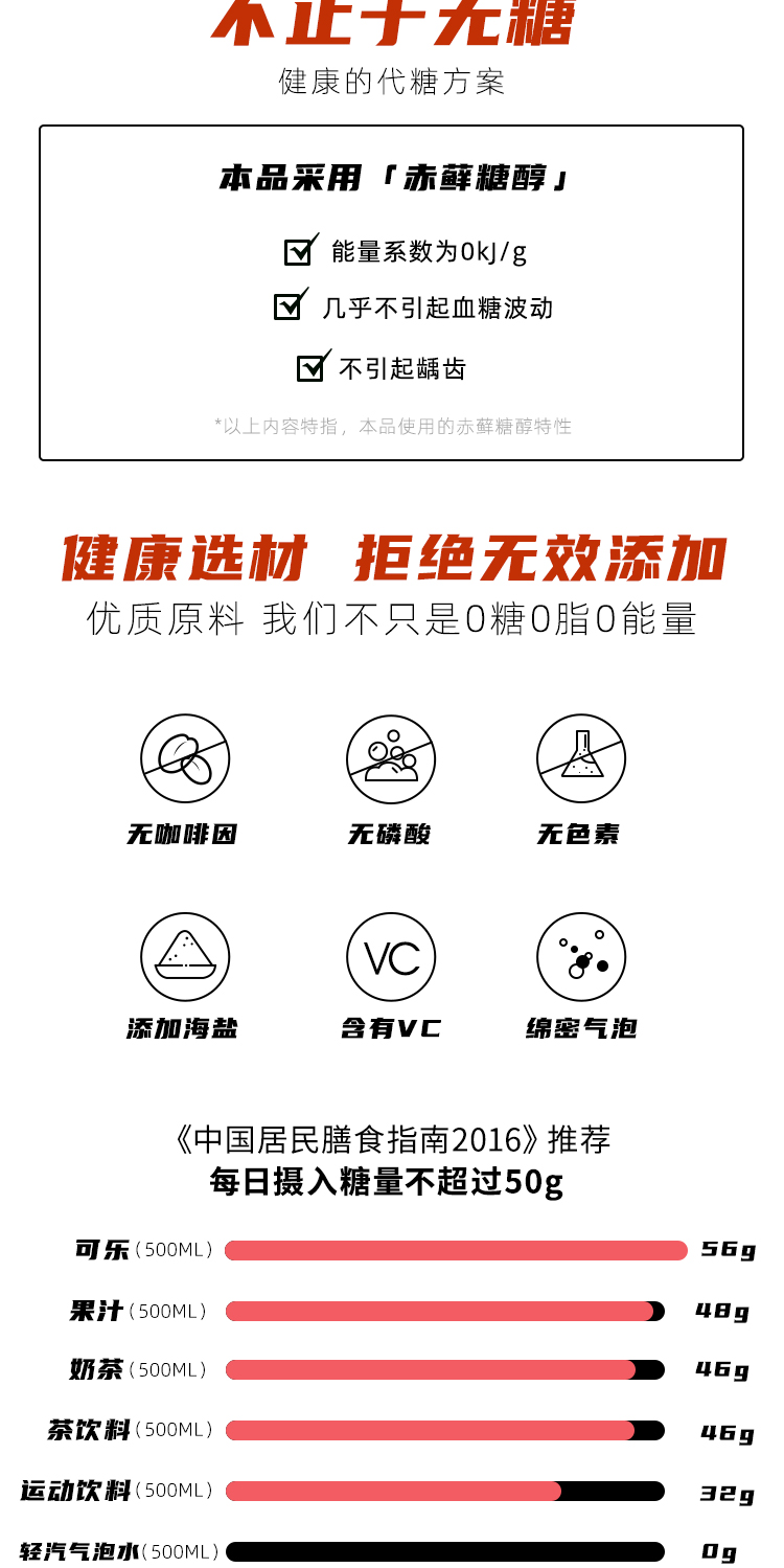 0蔗糖0脂0卡路里,对身体没有影响,采用「赤藓糖醇」口感清甜圆润,添加海盐,含有VC、自带气泡好喝瘦炸了,大人小孩均可饮用。