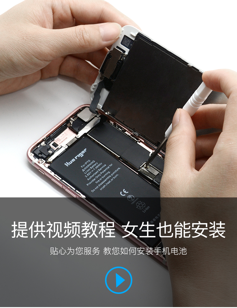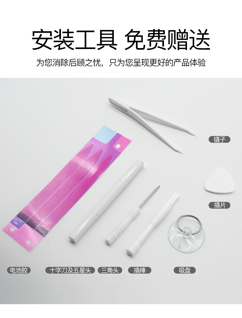 于是我就给6P换了大容量电池。和同类产品对比,华严苛的电池做工平整,体积最小,在相同容量下,体积越小电芯越好,电池密度更大。背面有绝缘覆盖不裸露,电池触点精准,IC板有涂胶。华严苛电池内带拆机工具,与iPhone拆机手册,三根易拉胶。