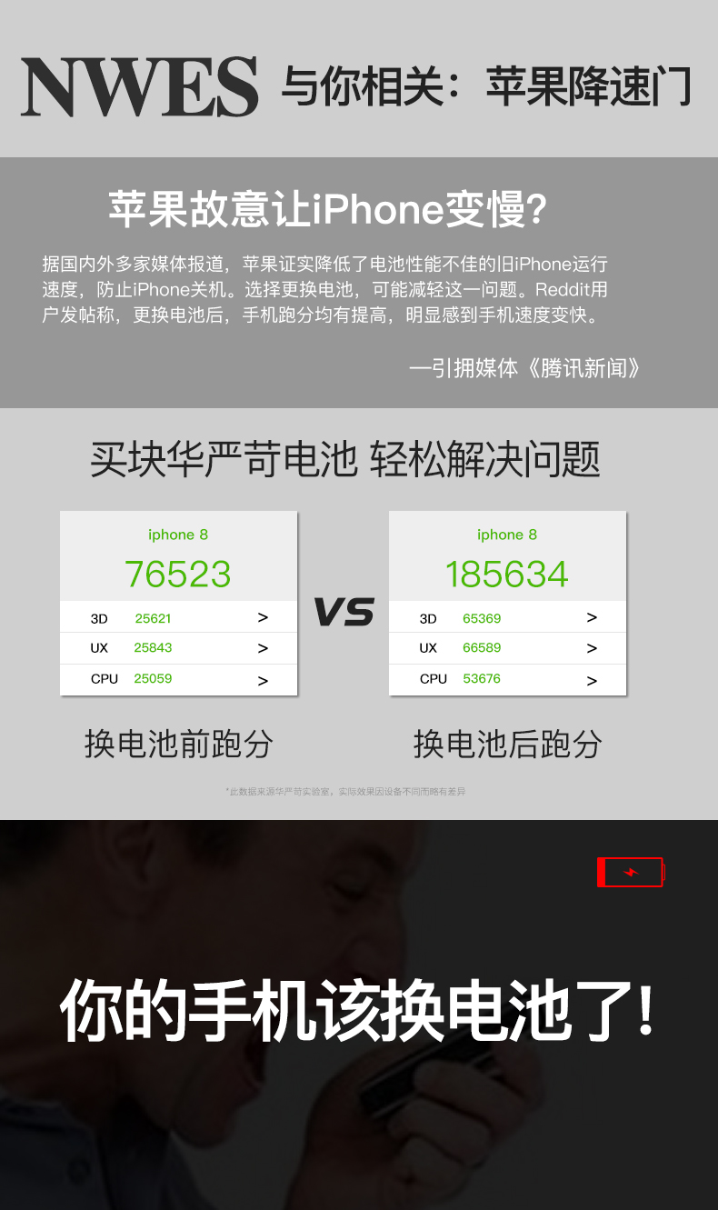 「苹果电池门」这是因为电池老化,苹果降低CPU频率以延长电池寿命的结果。在苹果设备的跑分软件中发现,更新iOS 11后,iPhone 6s分数从2500分左右,降到了1000-1500分之间。想解除降频限制,唯一的办法是换新的电池。