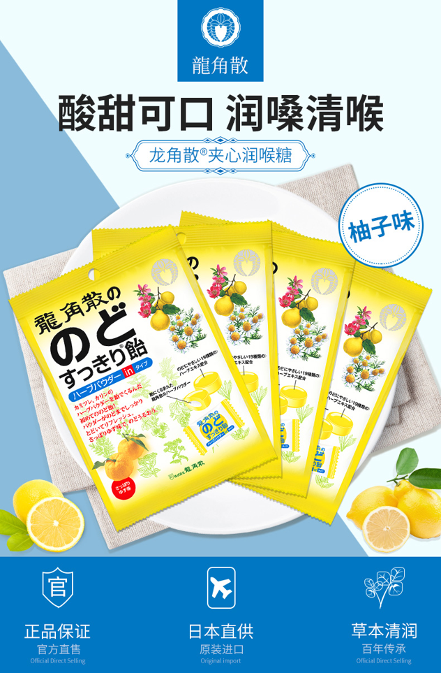 这款龙角散 柚子味夹心润喉糖,日本原装进口,是粉末和夹心的双重润嗓,直接作用于咽喉粘膜,性质温和,食用安全。添加的龙角散草本微粉均匀散布在润喉糖中,配合有益于咽喉的清新草本萃取物,持久护嗓。
