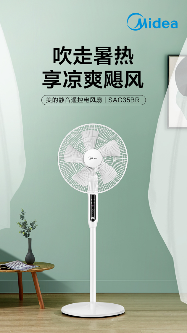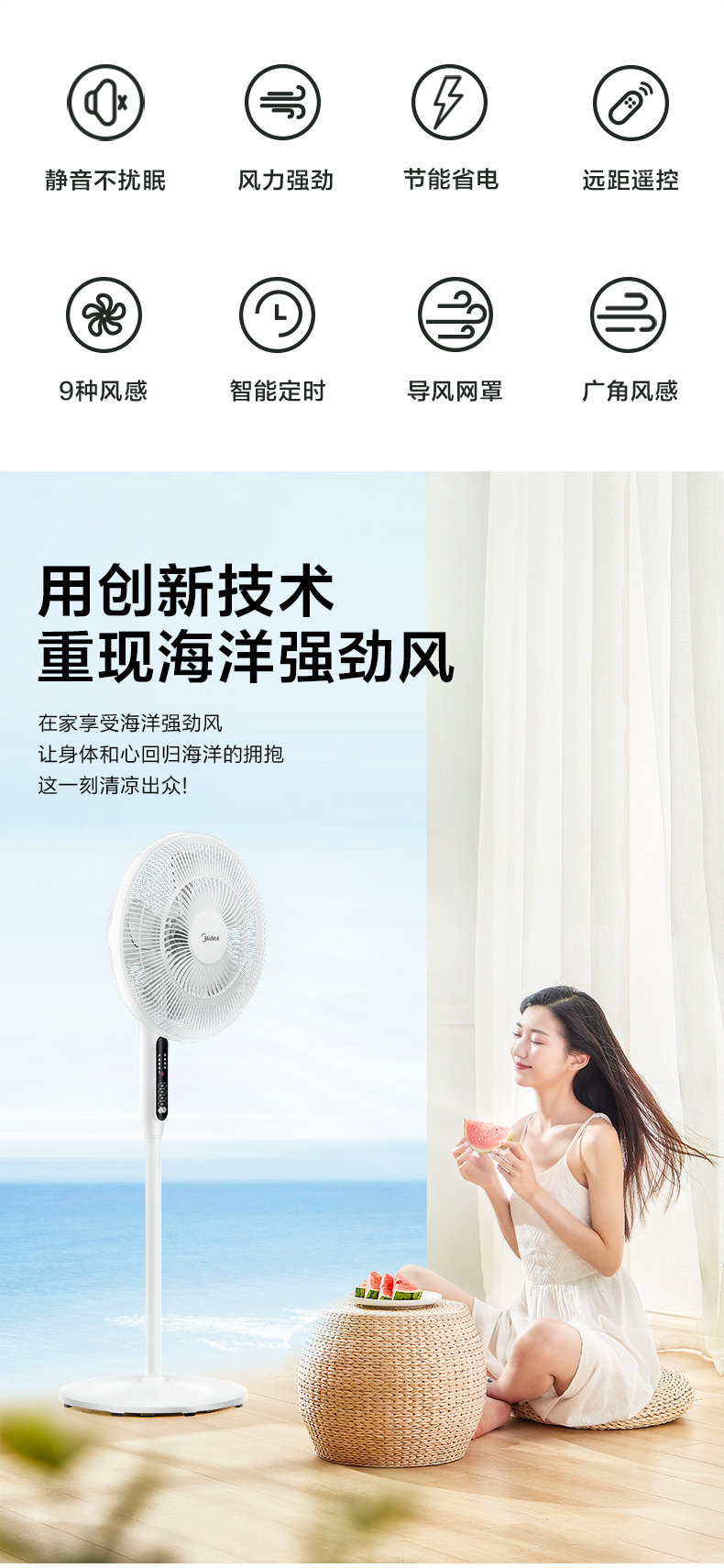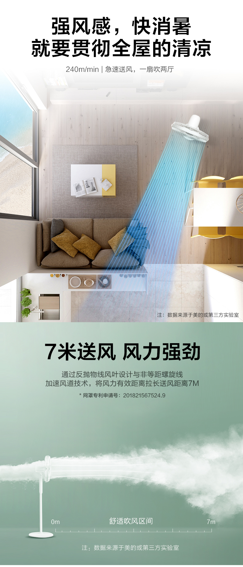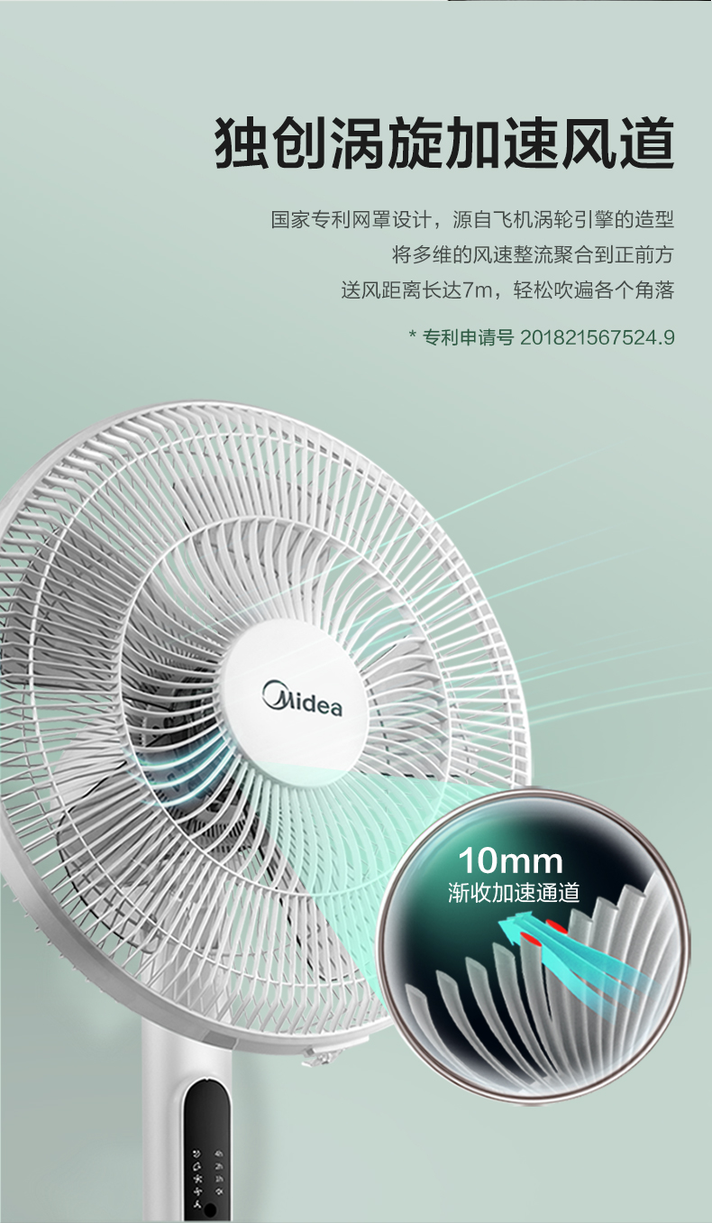 这款美的 FS40-10ERA 静音立式遥控电风扇,通过反抛物线风叶设计与非等距螺旋线加速风道技术,将风力有效距离拉长到7米,轻松吹遍各个角落。