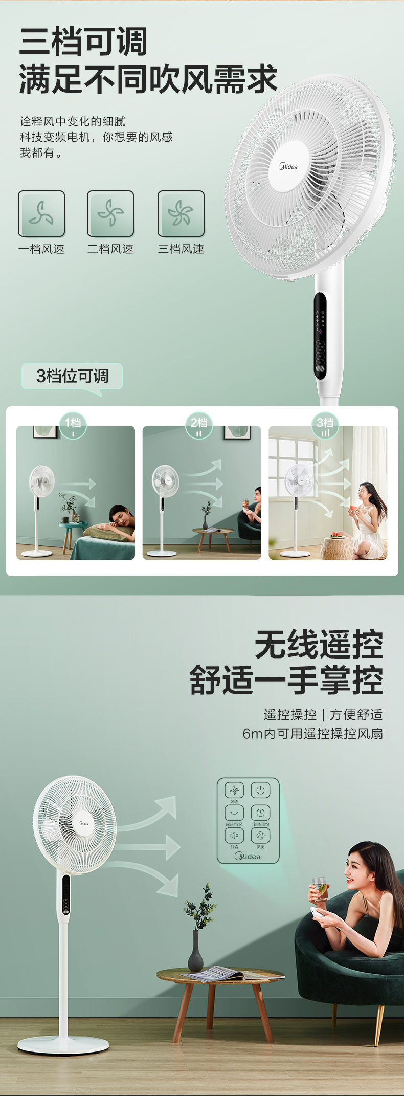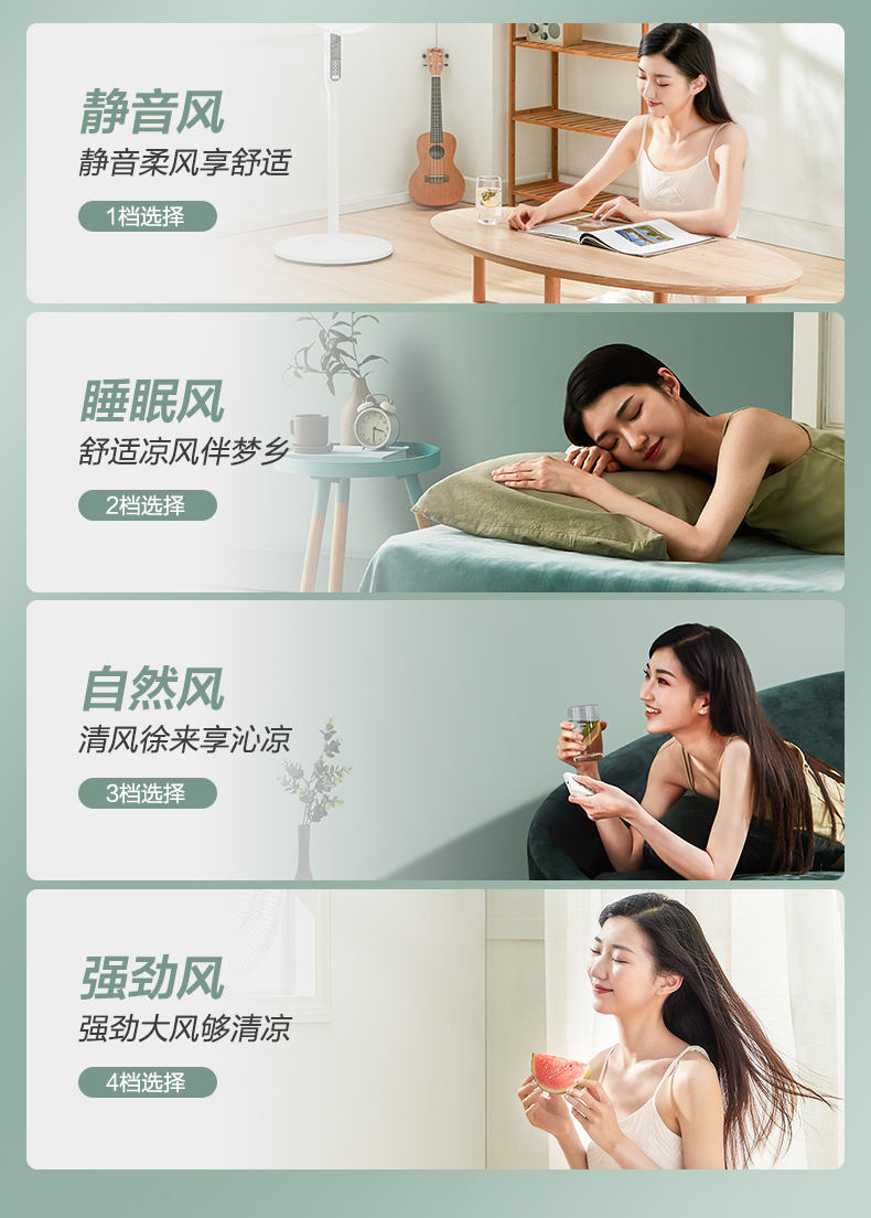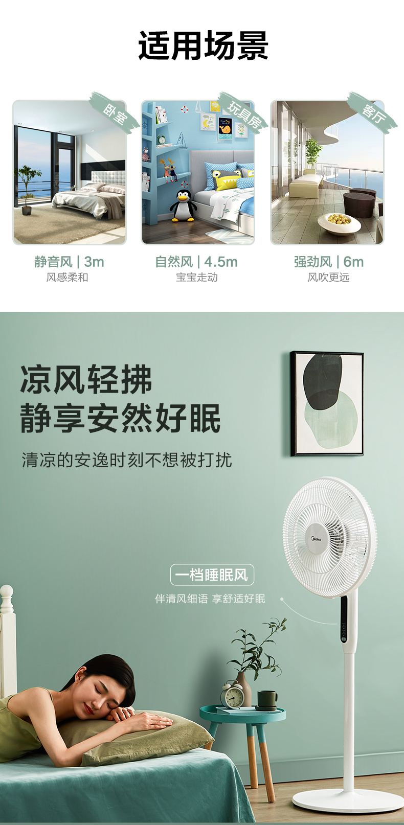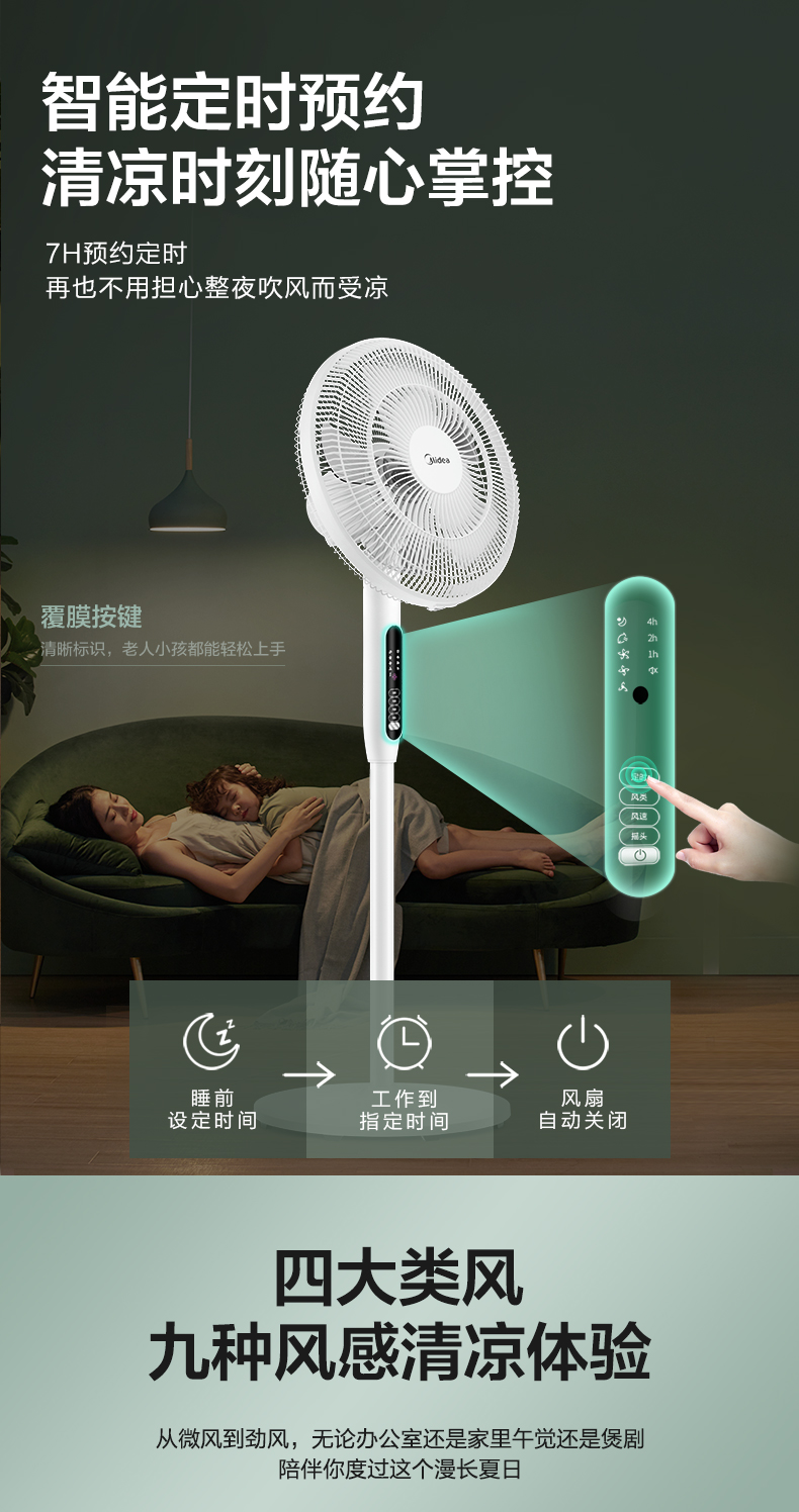 三档风速/四大类风,1档静音风、2档睡眠风、3档自然风、4档强劲风,满足不同吹风需求。可7小时预约,6m内遥控器遥控。