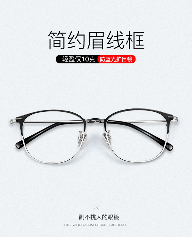 这款眼镜简约眉线框设计,简约好搭配,上脸不挑人,金属框采用IP电镀工艺,长时间使用不褪色、不生锈,镜框结实纤薄无负担,两侧镜腿柔韧设计,不易夹脸和夹耳,硅胶鼻托可根据自己的需求调整,舒适不压鼻。
